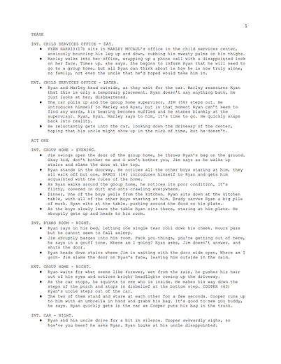 The biggest creative challenge when writing Starting Line was my personal lack of understanding and experience with many of the strong themes in the script, such as sports, grief and tragedy. While I obviously have a sense of awareness on these topics, my understanding was not nearly detailed enough in order to write a full pilot episode. Therefore, in order to gain a better understanding of these important themes, I consulted podcasts on loss and grief such as All There Is With Anderson Cooper, specifically the episode with Stephen Colbert as he talks about the loss of his mother. Additionally, I also consulted sources such as the NFL Video Rule Book and the Youth and High School Tackle Football Glossary. doing my best to understand these topics allowed for the script to feel more realistic and in turn helped my writing to be more authentic.